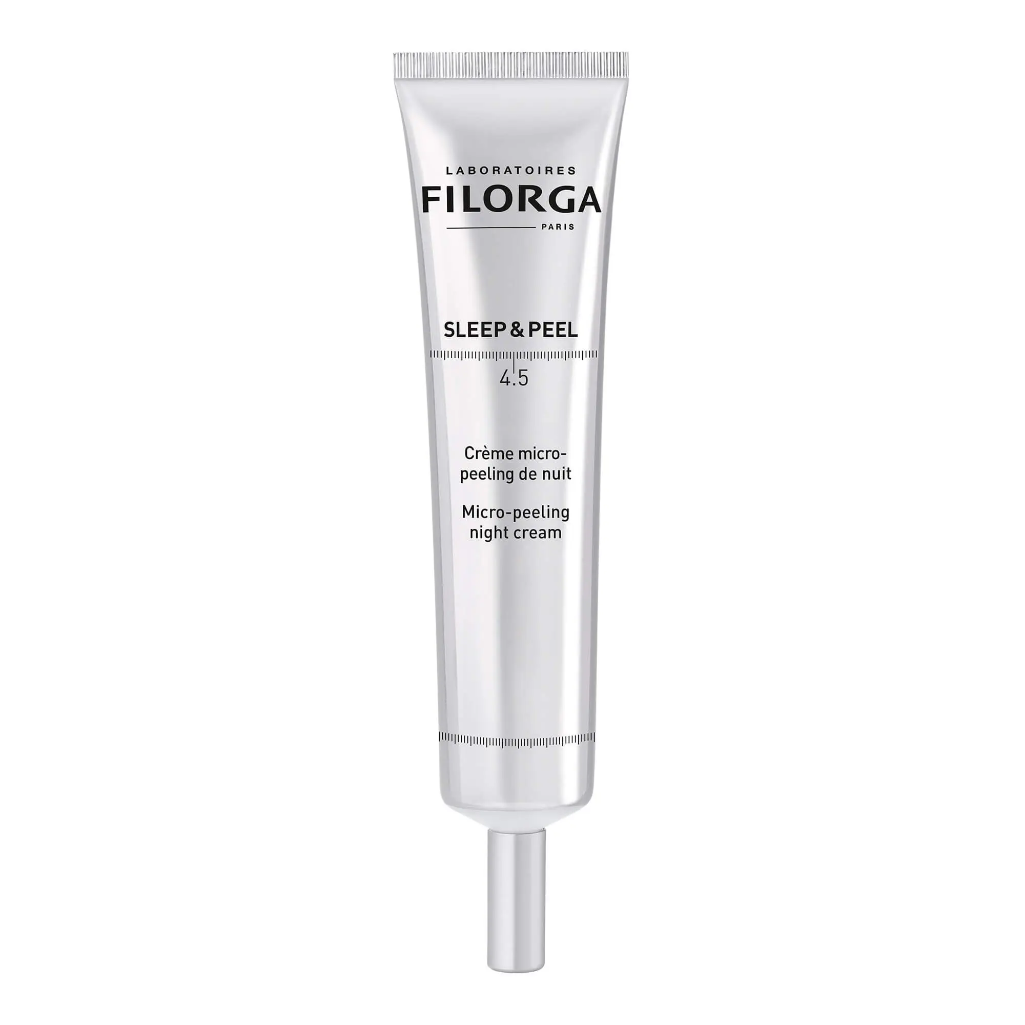 Crème de nuit micro peeling anti-rides Sleep&Peel 4.5 des Laboratoires Filorga, inspirée des peelings professionnels, qui stimule le renouvellement cellulaire, pour un effet peau neuve dès le 1er réveil !